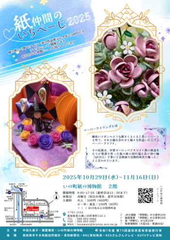 ペーパークイリング仲間による洋紙と和紙がコラボした作品を、約30点を展示します。