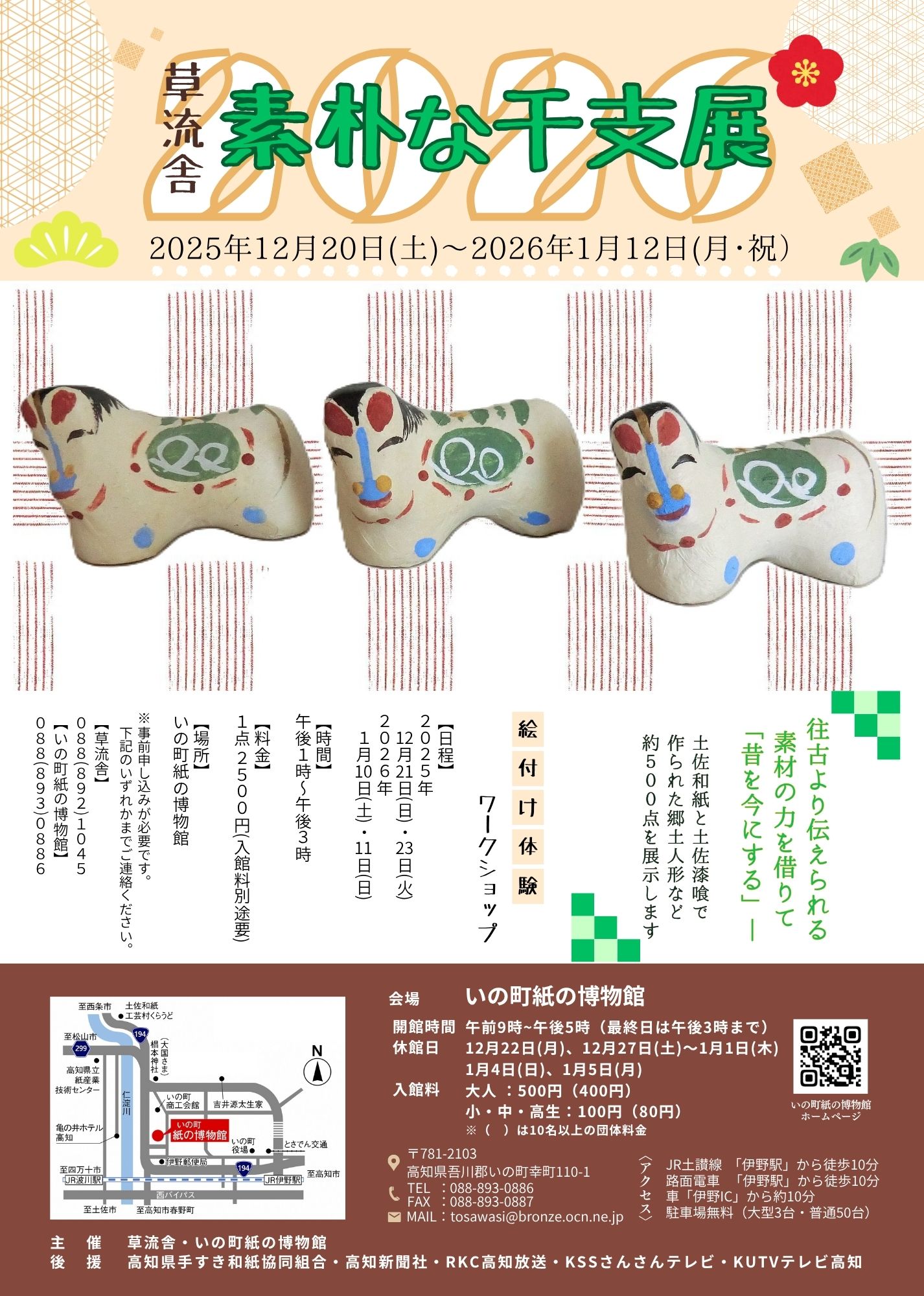 土佐和紙と土佐漆喰で作られた郷土人形など約500点の展示や、絵付けのワークショップを開催します。