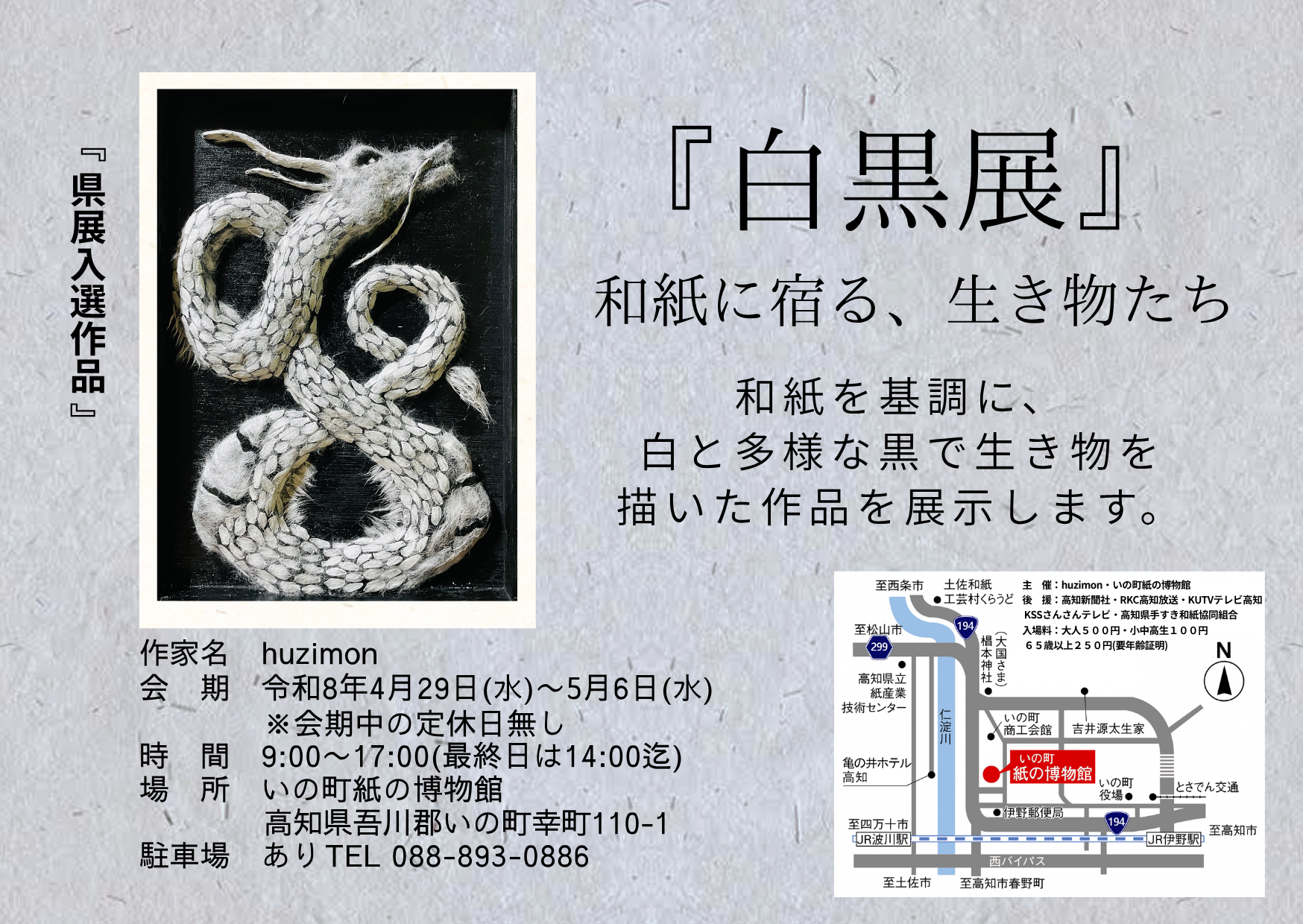 高知在住のhuzimon氏による和紙アートを中心に作品展示します。