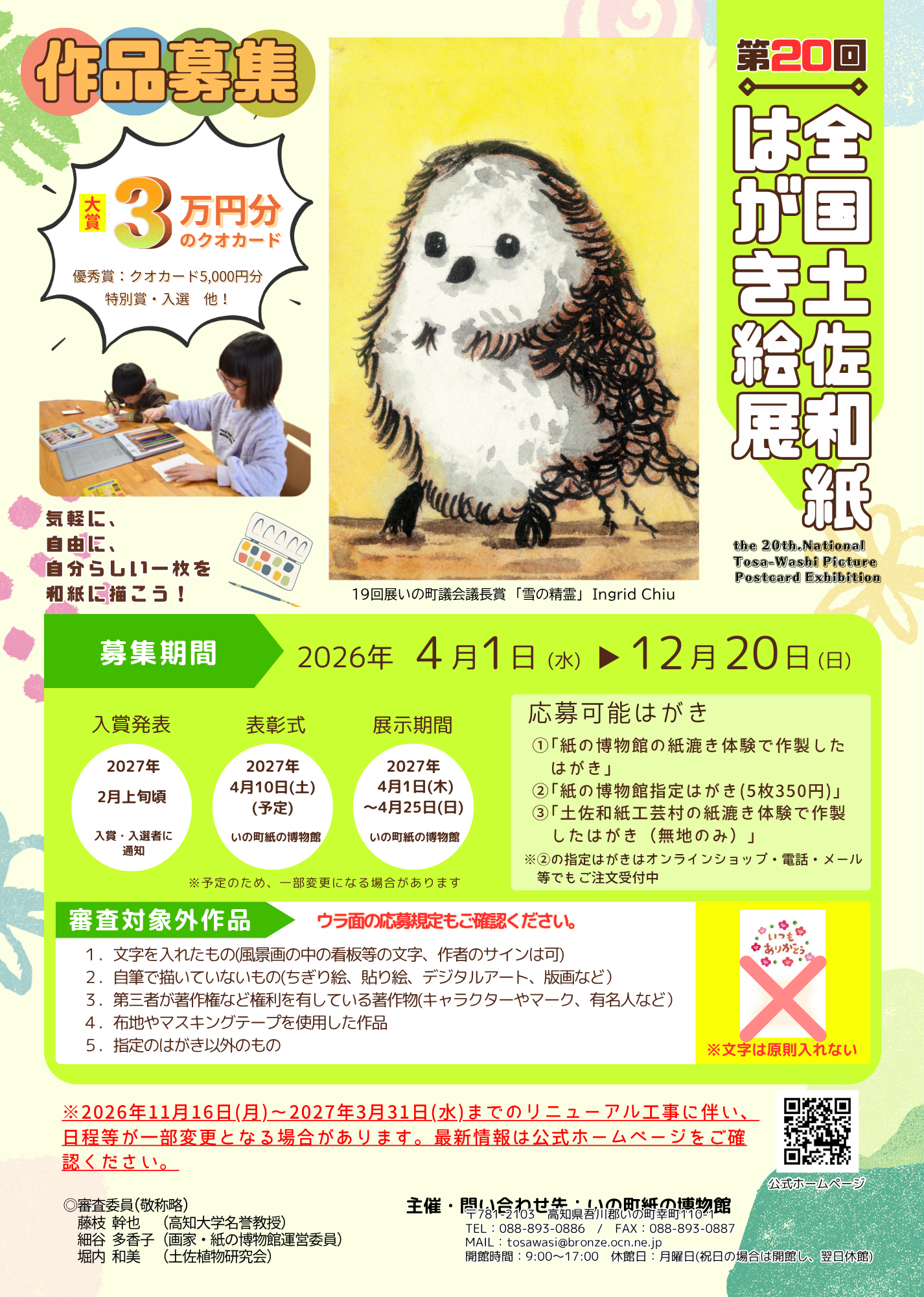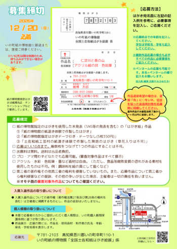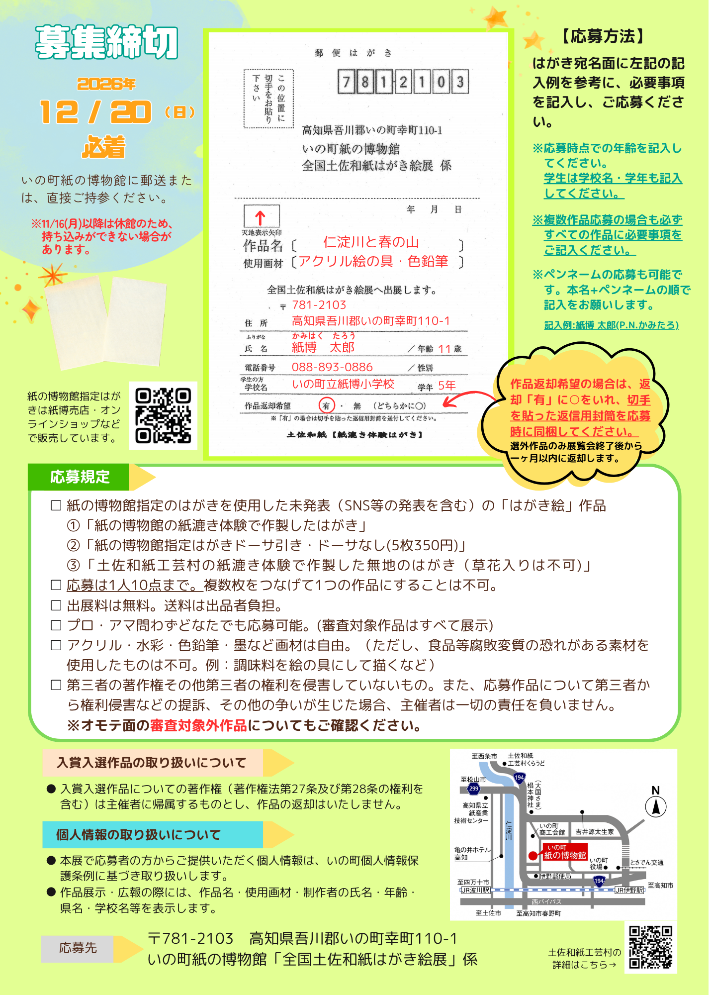 〒781-2103 高知県吾川郡いの町幸町110-1 いの町紙の博物館「全国土佐和紙はがき絵展」係
