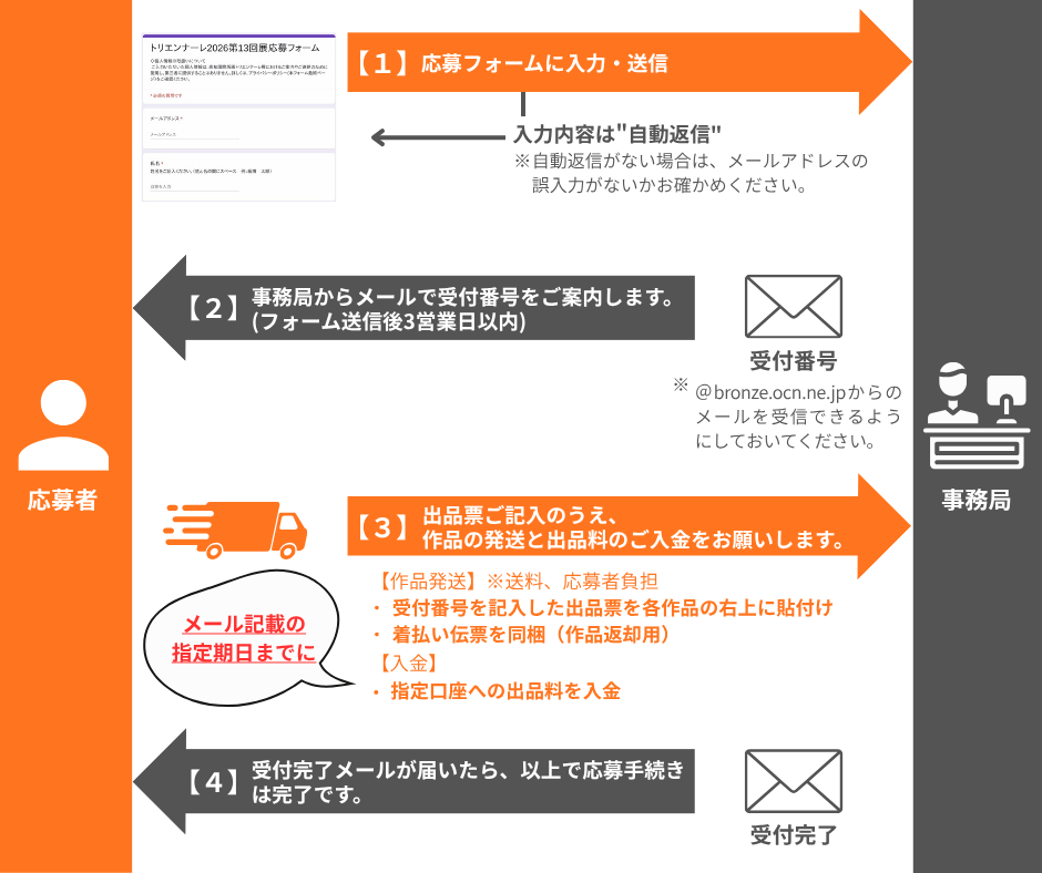 ※今回展は、Googleフォームでの応募のみとなります。応募フォーム公開後、下記の手順に沿ってお申し込みください。